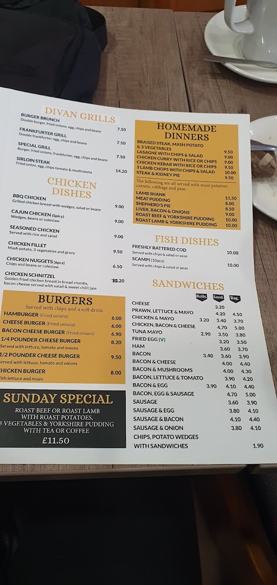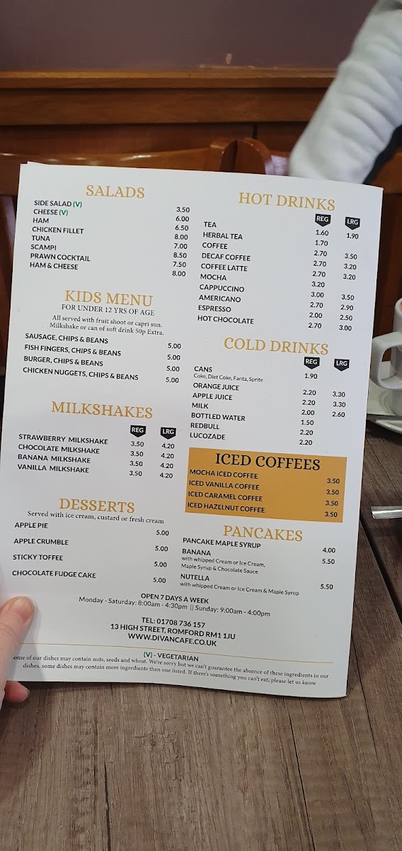 Welcome to Divan Cafe Romford, a gem nestled in the heart of Romford at 13 High St. Known for its welcoming atmosphere, this café has become a cherished spot for locals and visitors alike. The menu is a delightful mix of classic café favorites, showcasing a variety of fresh salads. Choices range from cheese at £6.00 to a succulent chicken fillet salad at £8.00. For those with a sweet tooth, the milkshakes, available in strawberry, chocolate, and banana, are all just £3.50, perfect for a refreshing treat.